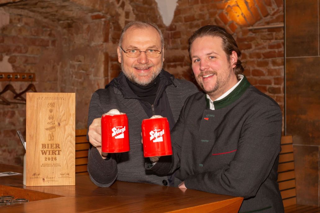 Der neue „Wirtshausführer Bierwirt des Jahres“ in Wien heißt Michael Zattl (li) – überreicht wurde die Auszeichnung von Stiegl-Bierversilberer Peter Ruzicka. Foto: fotogarage Bergmann / Abdruck honorarfrei!
