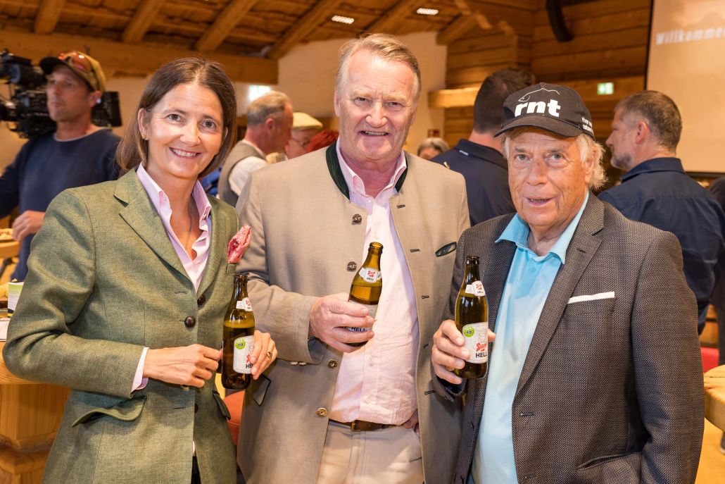 Freuen sich über die Sammelfreude der Stiegl-Community für die Bachforelle und für saubere Gewässer (v.l.): die Stiegl-Eigentümer Alessandra und Heinrich Dieter Kiener mit River and Nature-Trust-Gründer Peter Schröcksnadel. Foto: wildbild / Abdruck honorarfrei!